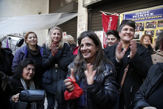 Ministry of Finance laid-off women cleaners react as they watch the new Greek Finance Minister Yanis Varoufakis announcing that the government will re-hire them, in Athens, on January 28, 2015